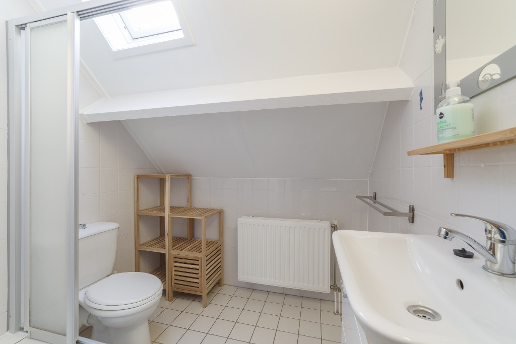 Toilet begane grond, badkamer 1e verdieping met douche, wastafel en toilet.