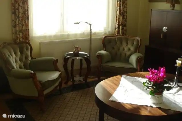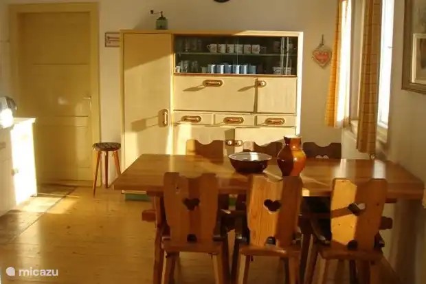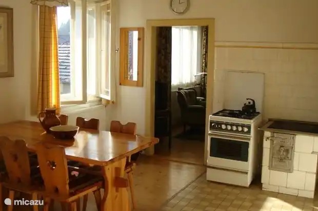 In de badkamer is een douche, een vaste wastafel en een wasmachine aanwezig. In een aparte ruimte staat een koelkast met diepvries en de schoonmaakapparatuur. Vanuit de eerste verdieping is er toegang tot een riant dakterras, van waaruit u een fraai uitzicht hebt op de tuin, met tuinhuisje en het berglandschap en een brede trap naar de tuin. Uiteraard zijn tuinmeubilair en zonneparasol aanwezig. Genieten van een ontbijt op het dakterras met een wijds uitzicht. Vanuit de hal is er een vaste trap naar de tweede verdieping. Dit is een zelfstandige wooneenheid, maar in combinatie met de eerste verdieping ideaal voor een groep van 6 – 8 gasten. Bovendien is er voldoende ruimte voor het extra plaatsen van een of twee kinderbedjes. Via de overloop krijgt u toegang tot een tweepersoonsslaapkamer en een woonkamer annex slaapmogelijkheid voor 2 personen. De keuken biedt alle noodzakelijke accommodatie zoals: een keramische koolplaat, afzuigkap, magnetron, koelkast met vriesvak. De badkamer bestaat uit een douche, wastafel en toilet.Rondom is een volledig omheinde zeer ruime tuin met grote overkapping een zitje en overdekte eigen parkeerplek. In de tuin zijn verschillende oude fruitbomen en een schattig tuinhuisje. Er is ruimte om van de rust te genieten, of juist een potje te voetballen. Huisdieren zijn welkom en door de volledige omheining kan de hond veilig los lopen.