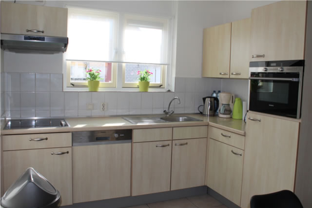 offene Küche, Mikrowelle, Elektroherd, Kühlschrank mit Gefrierfach, Geschirrspüler.