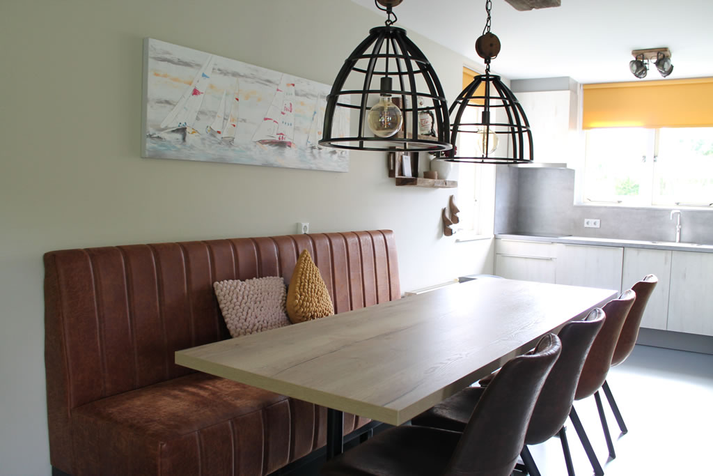 Deze woning heeft een warme uitstraling, met een heerlijke zitbank bij de eettafel.