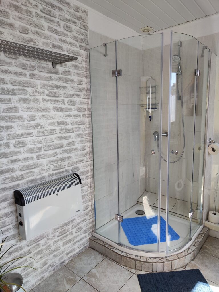Badkamervoorzieningen: toilet, douche en dubbele wastafel