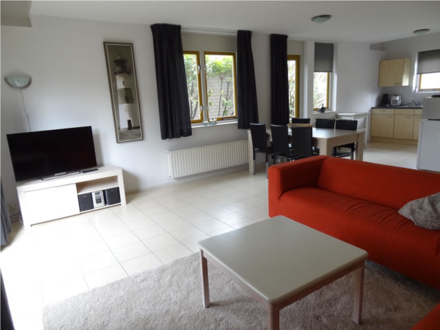 Ruime woonkamer met open keuken inclusief wasmachine en vaatwasser. Er is een flatscreen TV aanwezig.